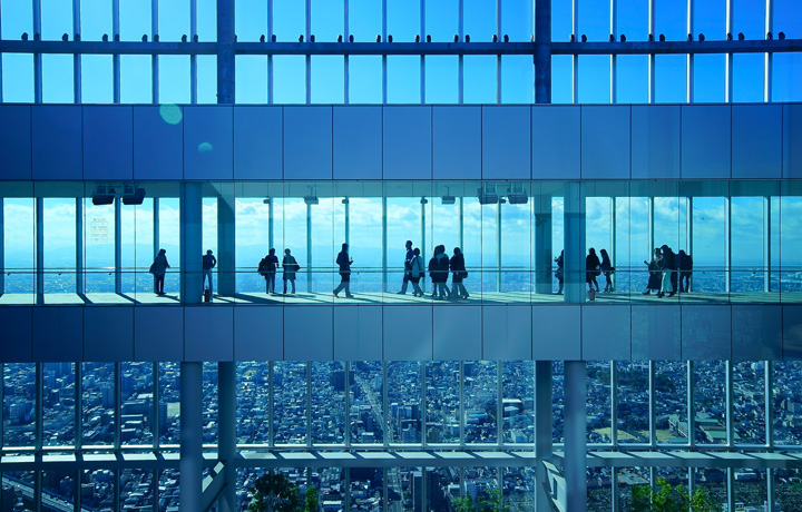 최상층 60층은 오사카 평야를 조망할 수 있는 동서남북 360도 유리로 된 실내 회랑입니다.