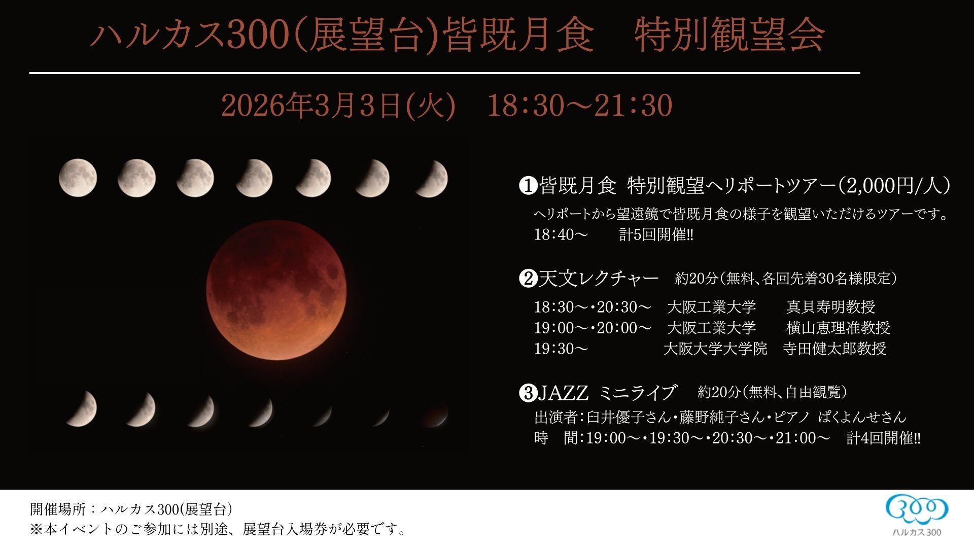 ハルカス300(展望台)では、皆既月食が見られる2026年3月3日(火)に、「皆既月食特別観望会」を開催いたします! 当日は、18:50頃に月が欠け始め、20:04頃に皆既が始まり、21:03頃に皆既が終わる予定となっております。 この特別な皆既月食の時間をご来場の皆様にお楽しみいただけるよう、ヘリポートから皆既月食の様子を観望できるツアーや、 専門家による天文や皆既月食にまつわるお話を聞いていただけるイベントを開催いたします。 この日しかお楽しみいただけない特別な観望会に是非お越しください。