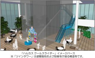 「ハルカス クールスライダー」は7月中旬から始まる、本格的な夏のお出かけシーズンに合わせ、特にお子様にお楽しみいただけるよう企画したもので、「ハルカス300」の58階“天空庭園”の西側にある通称「ツインタワー※」のすき間、幅約60cmの空間に設置し、その空間の高さ約7mから屋外空間に滑り出る爽快感を楽しんでいただくアトラクションです。
