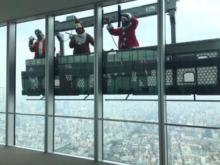 クリスマス時期に合わせ、ゴンドラに乗った外壁ガラス清掃員がサンタクロースの衣装をまとって登場します!!